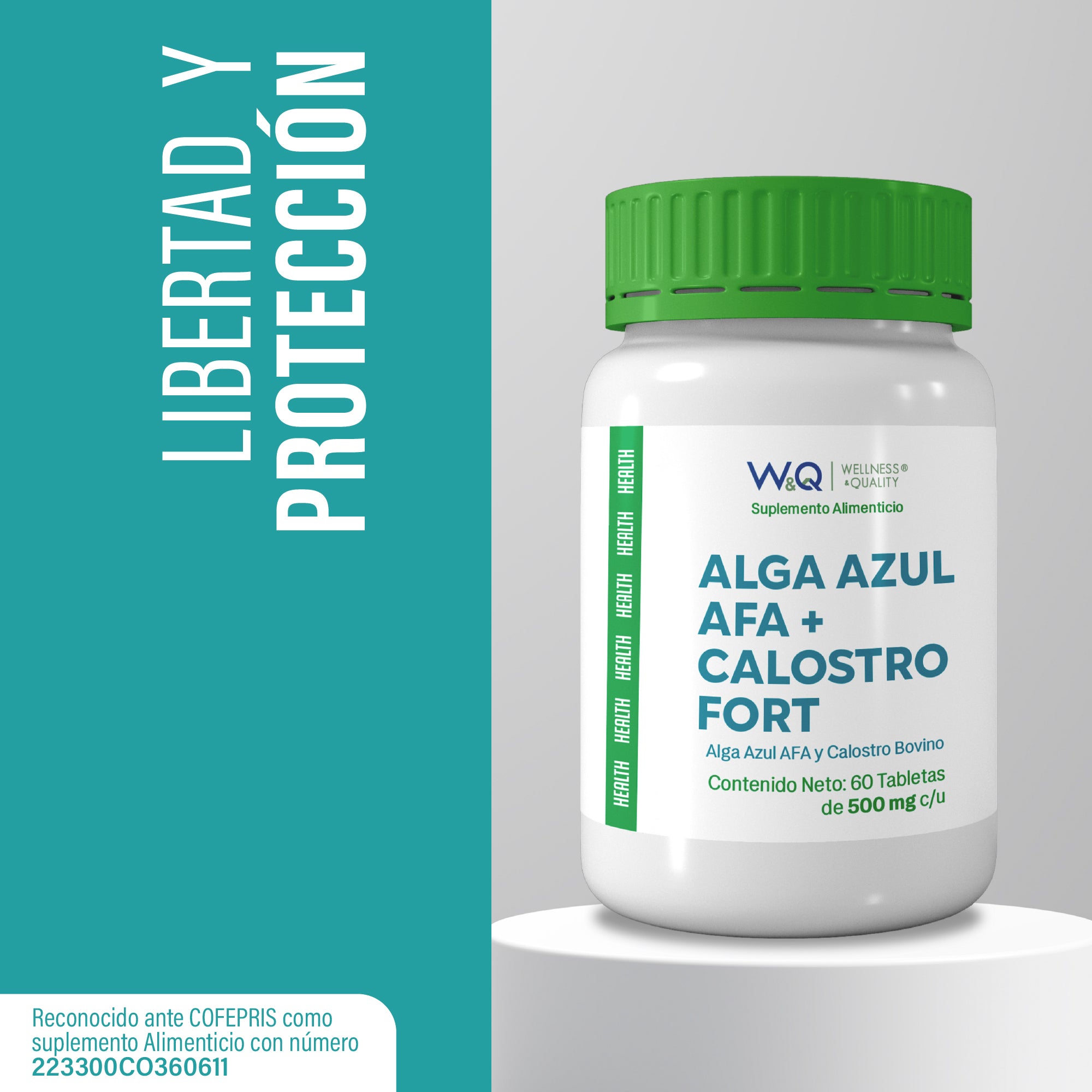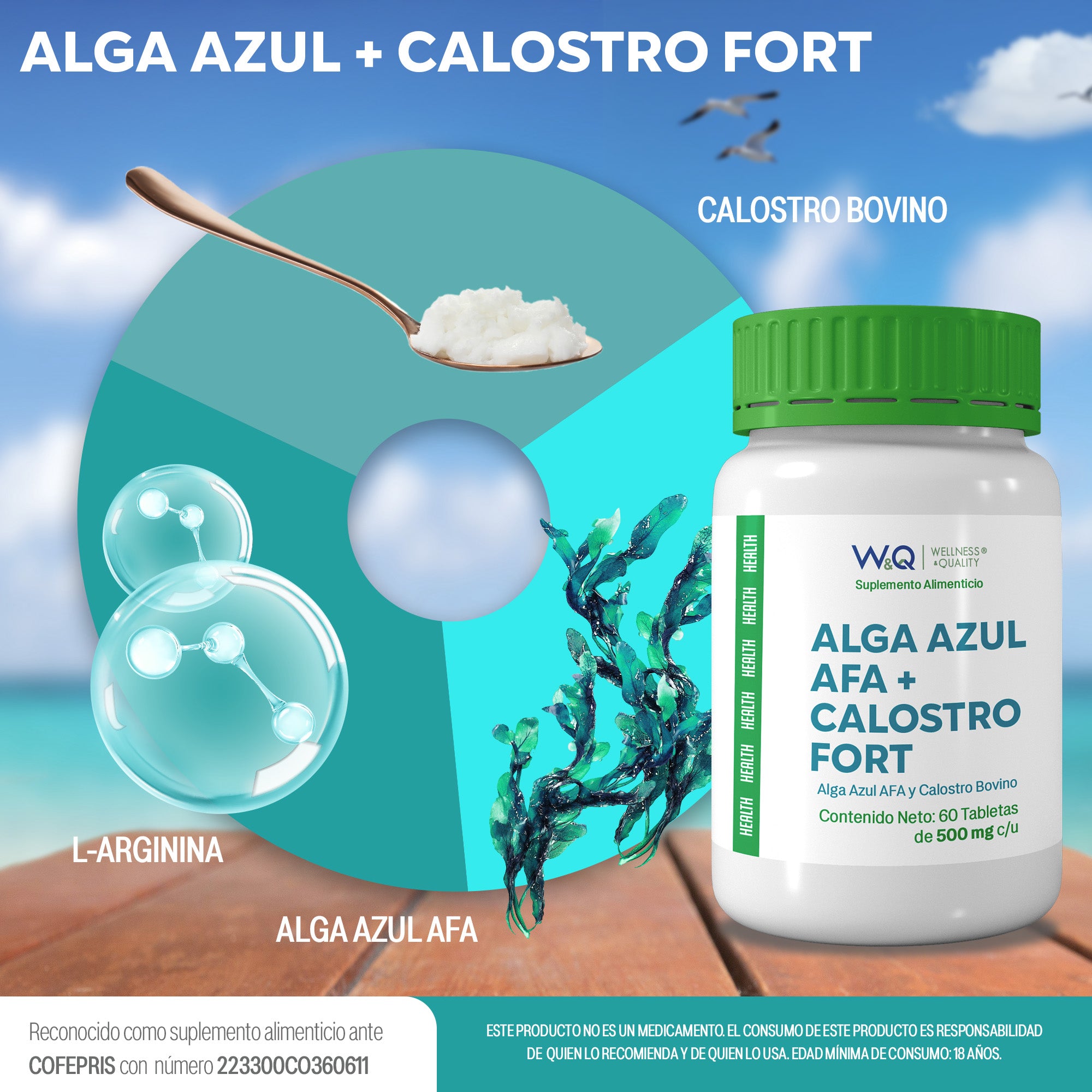 W&Q Health, Alga Azul AFA + Calostro Fort con L-Arginina, 60 Tabletas 500 mg por porción.