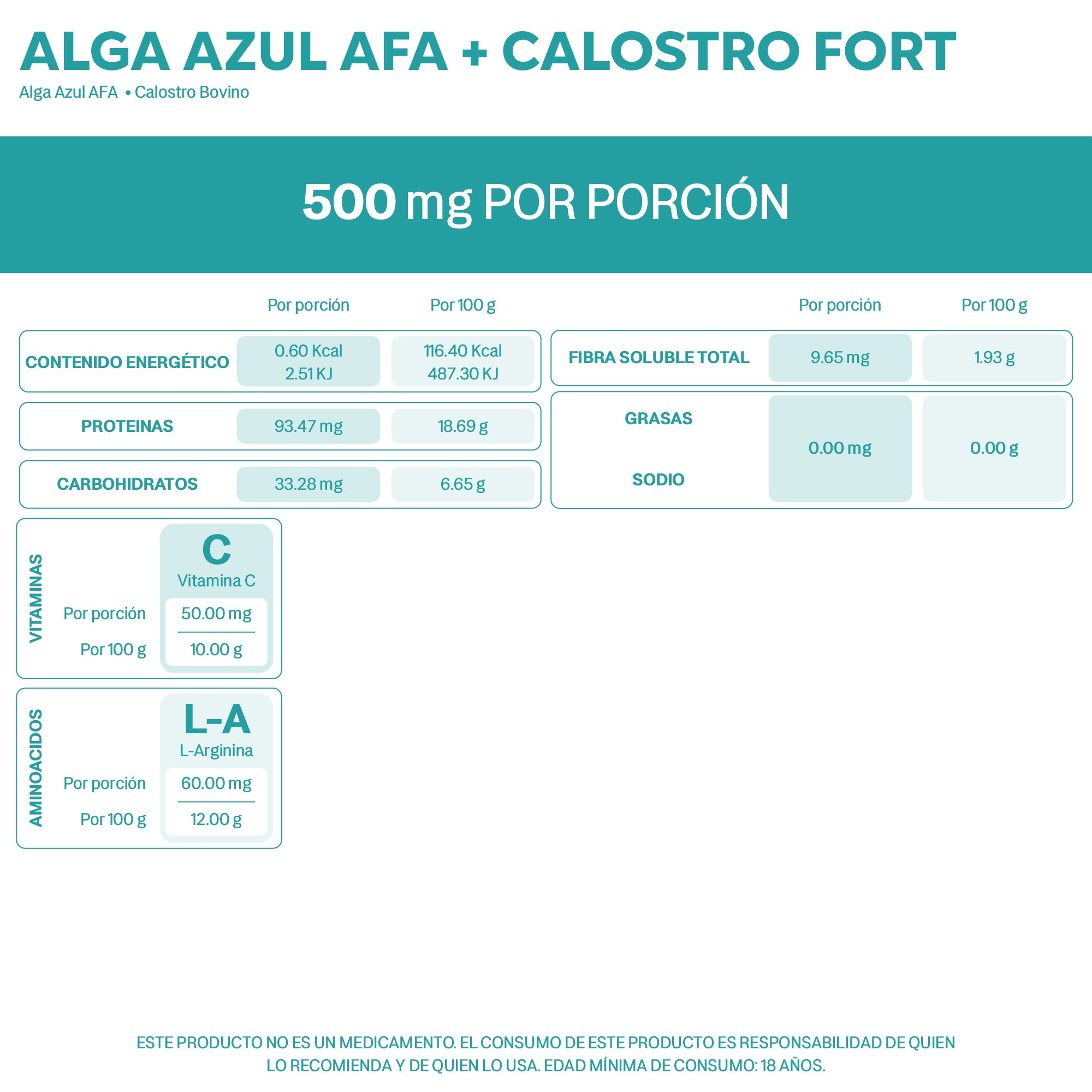 Alga Azul AFA + Calostro FORT es un suplemento alimenticio formulado con ingredientes de origen natural: alga azul AFA y calostro bovino. Estos componentes han sido utilizados tradicionalmente como parte de una dieta variada y balanceada, por su contenido en nutrientes esenciales como vitaminas, minerales, proteínas y compuestos bioactivos.