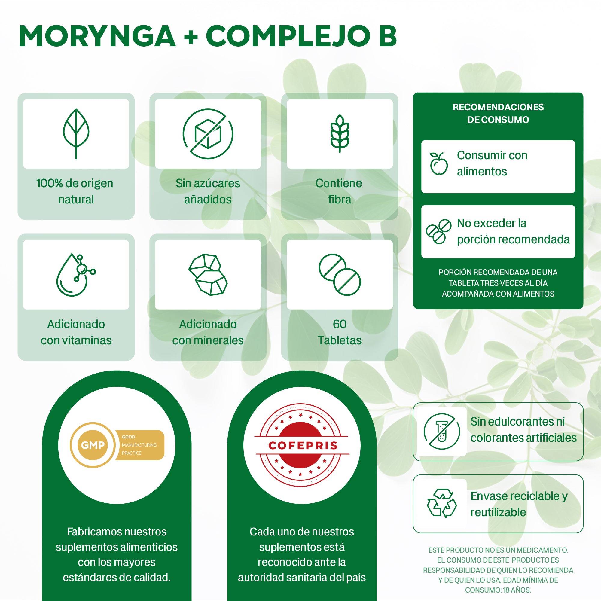 Morynga + Complejo B es un suplemento alimenticio formulado con extracto de moringa y un conjunto de vitaminas del complejo B. Esta combinación busca complementar una alimentación balanceada con ingredientes de origen vegetal y micronutrientes esenciales.
