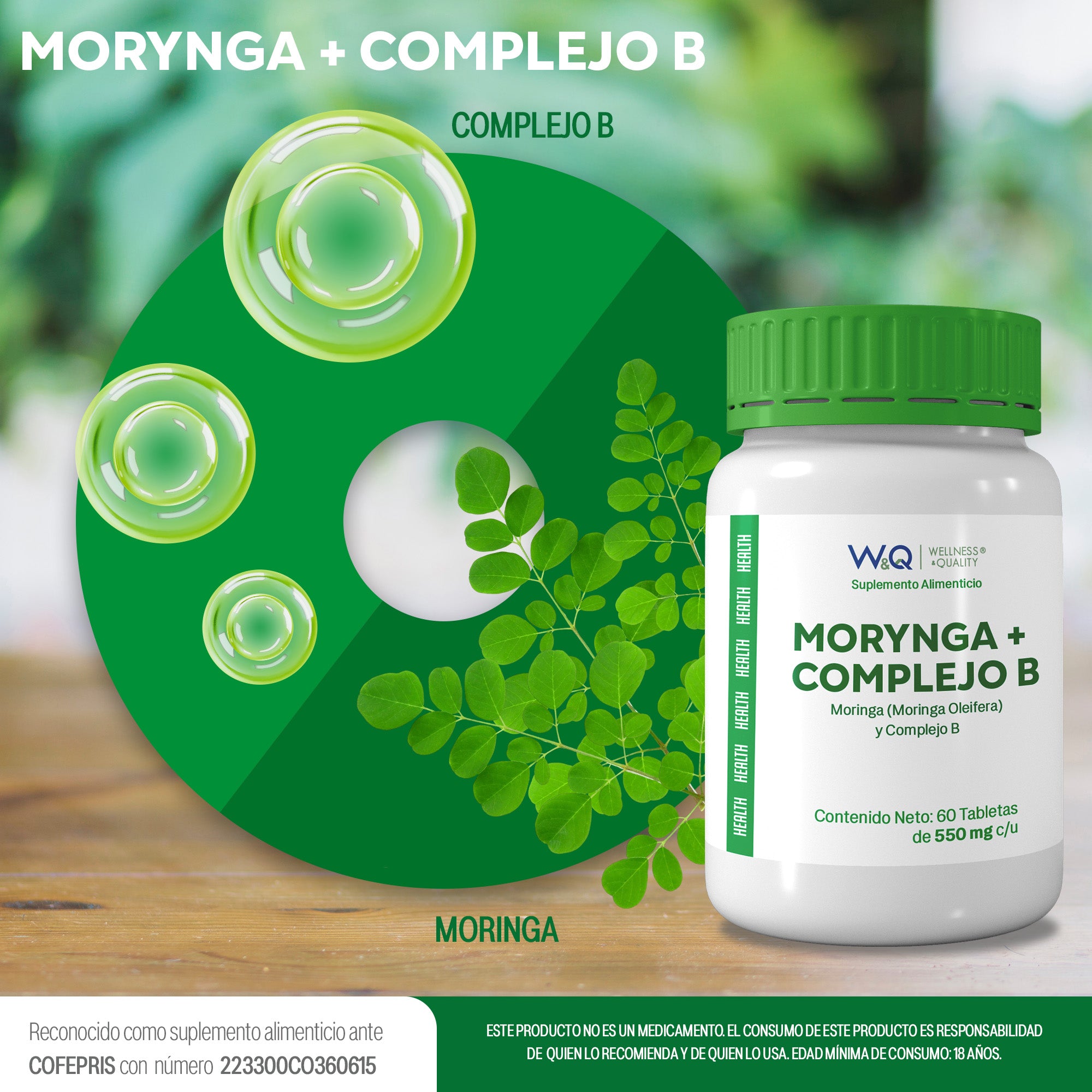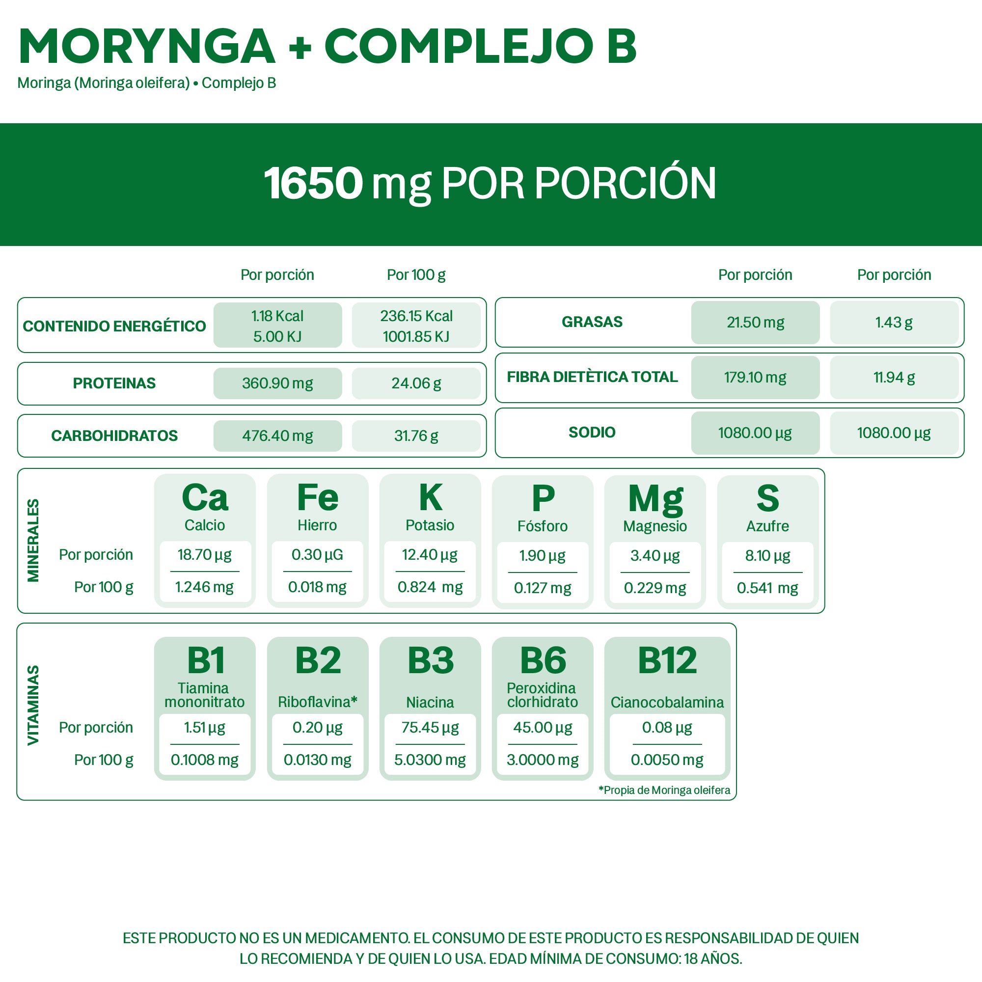 La moringa es una planta reconocida por su contenido en compuestos naturales como polifenoles, carotenoides y minerales, mientras que las vitaminas del complejo B están involucradas en diversas funciones metabólicas del cuerpo humano.